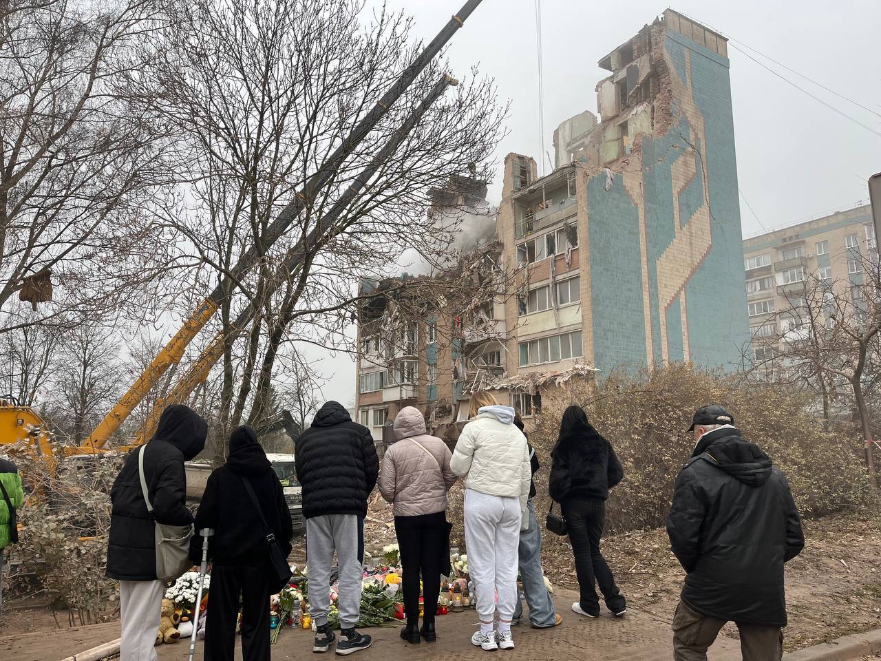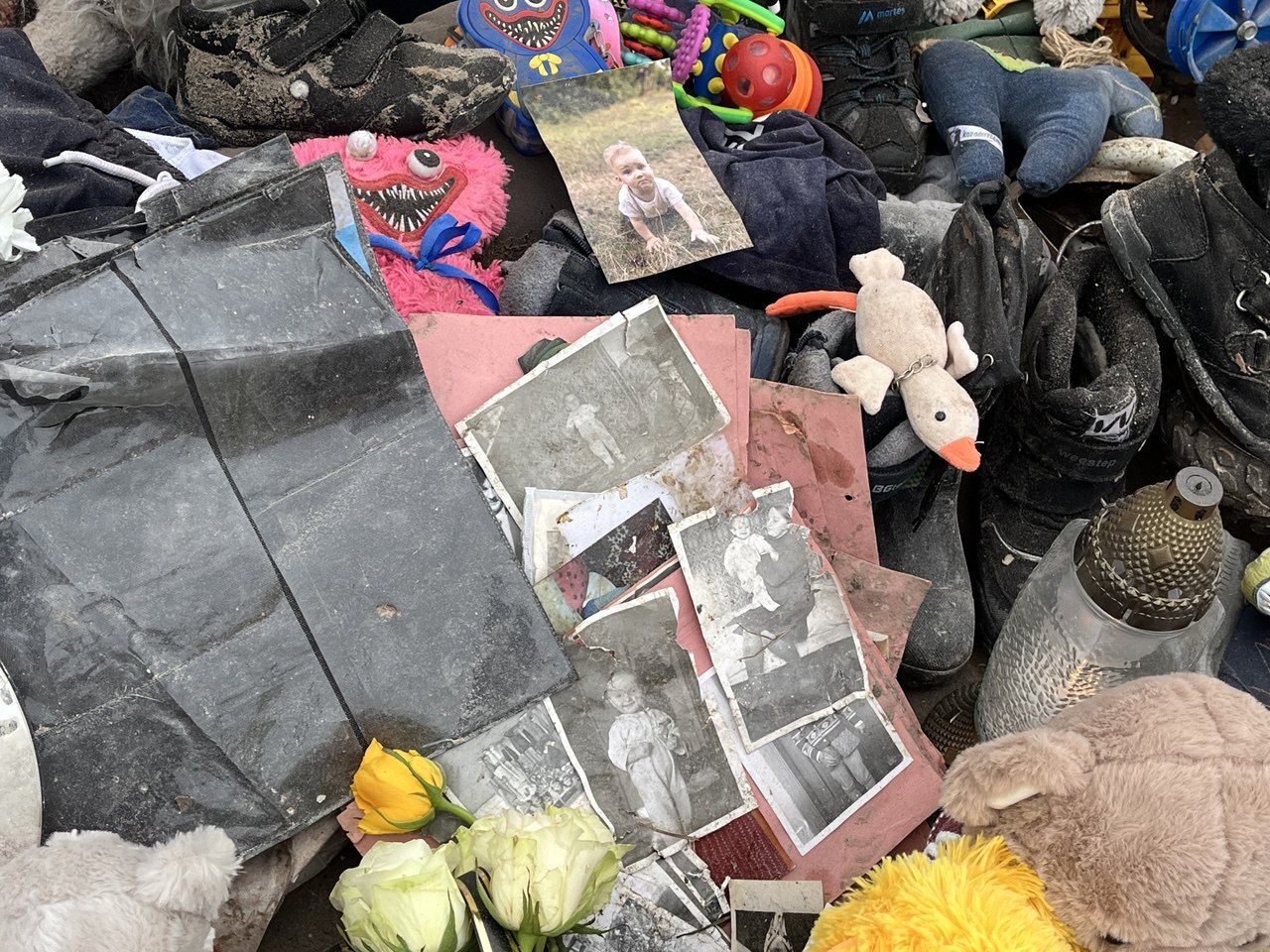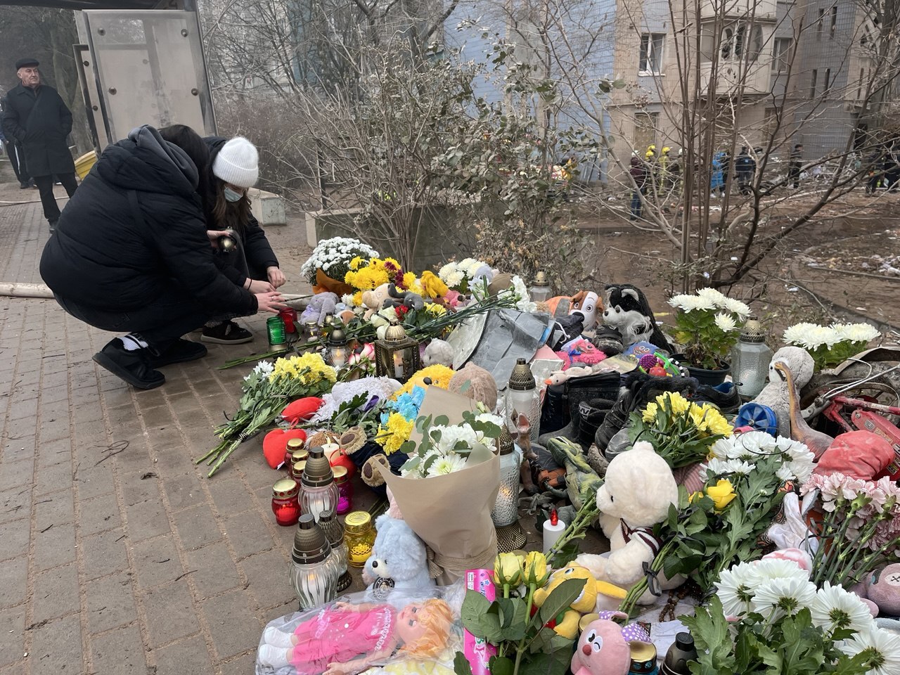 На купках з іграшками та квітами можна побачити дитячі фотографії з сімейних альбомів, знайдених на місці обстрілів. Також є дитячий велосипед, який дістали з-під завалів. Рятувально-пошукові роботи біля зруйнованих ракетами будинків та вул. Стуса і 15 Квітня тривають.
