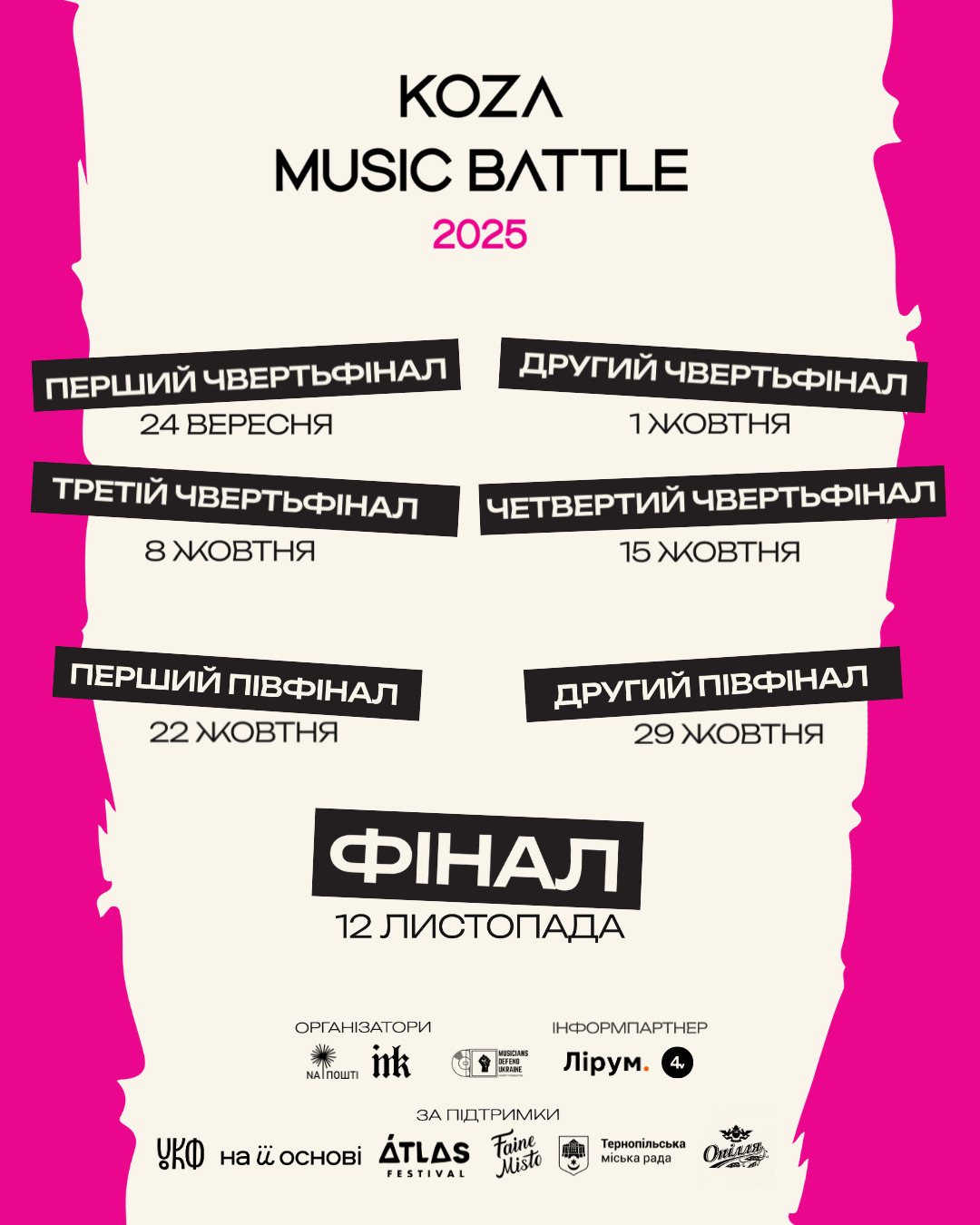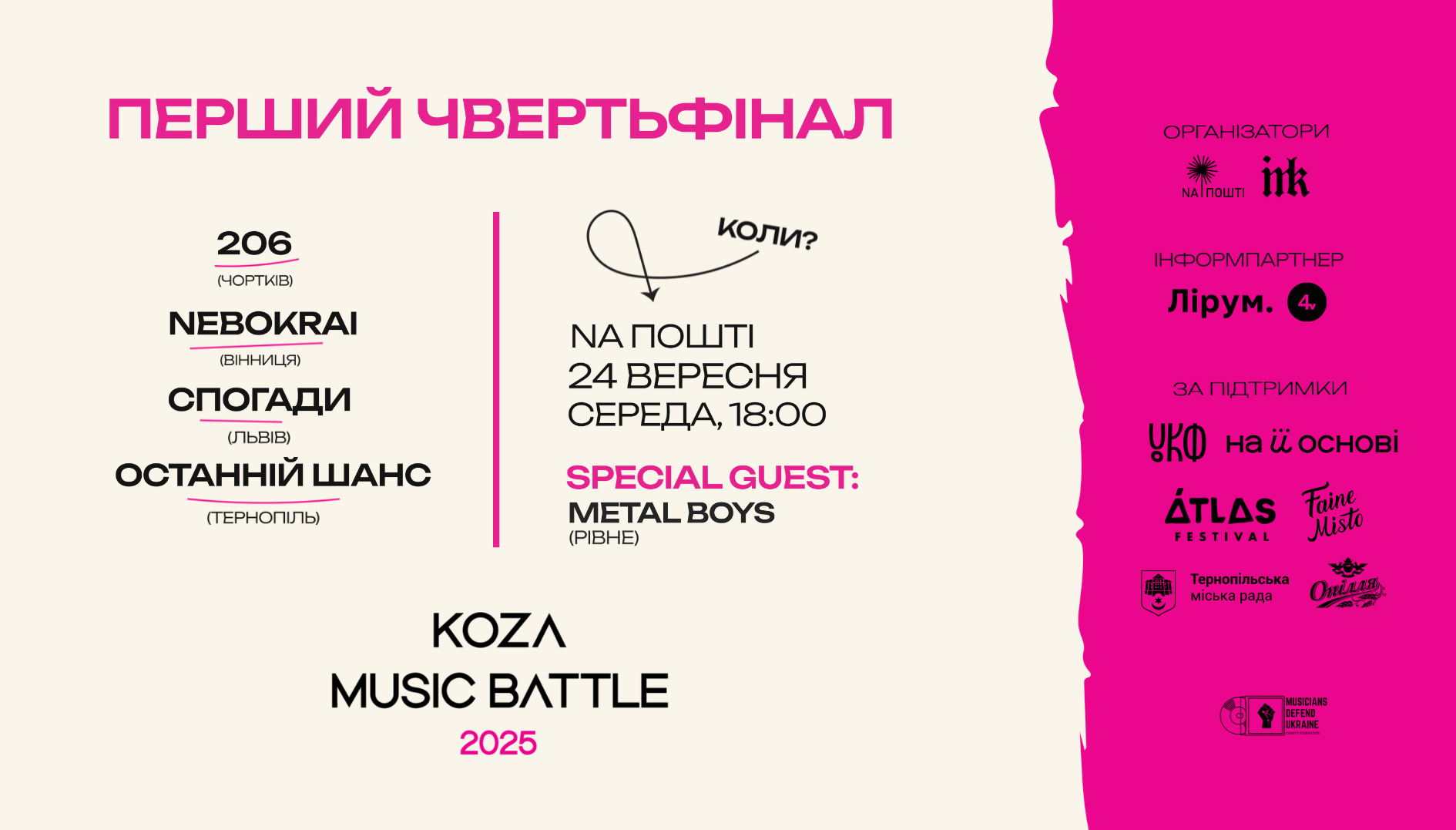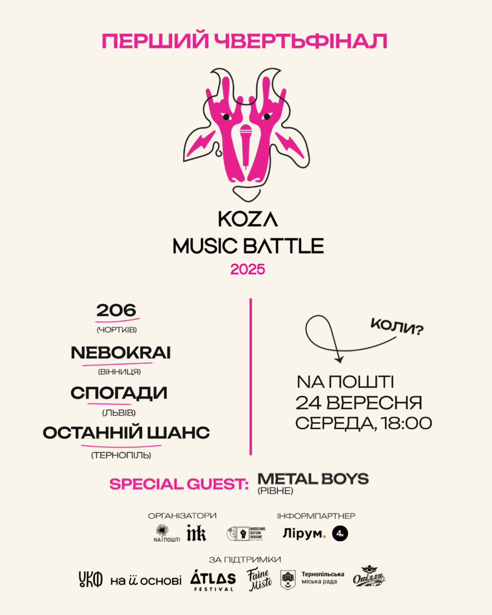 Тернопільський конкурс Koza music battle цьогоріч отримав 140 заявок від молодих неформальних гуртів з-понад 30 міст і містечок України. Третина колективів має у складі учасників, які змушені були покинути свій дім через війну, але продовжують займатися творчістю. Понад 9% залучає людей, для яких інвалідність не стала на заваді заняттям музикою. Ще 3,4% гуртів мають честь виступати разом із артистами, які захищали нас в АТО/ССО.