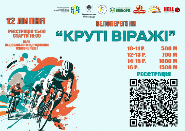12 липня у Парку Національного відродження відбудуться щорічні змагання з велосипедного спорту «Круті віражі» для дітей та підлітків віком від 10 до 16 років. Ця подія - чудовий шанс для молодих спортсменів продемонструвати свою спритність, швидкість та волю до перемоги. Про це повідомили у пресслужбі Тернопільської міської ради.