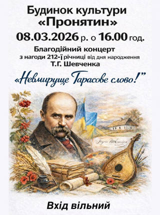 У неділю, 8 березня, у Будинку культури «Пронятин» у Тернополі відбудеться благодійний концерт «Невмируще Тарасове слово», присвячений 212-й річниці від дня народження Тараса Шевченка. Про це повідомила Тернопільська міська рада.