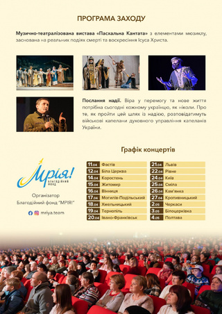 «Пасхальна кантата» - це музично-театралізована вистава, яка відображає справжній зміст свята Воскресіння, та у цей непростий час для України пропонує поринути у неймовірну, але реальну історію торжества життя над смертю, перемоги світла над темрявою, що надихне кожного глядача і сповнить вірою у світле майбутнє.