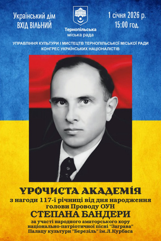 1 січня 2026 року в Тернополі проведуть урочисту академію з нагоди 117-ї річниці від дня народження Степана Бандери. Повідомила Тернопільська міська рада.