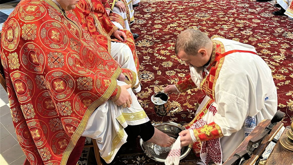 Після заамвонної молитви архиєрей, наслідуючи приклад Ісуса Христа під час Тайної Вечері, перепоясався рушником, влив освячену воду до умивальниці та обмив ноги дванадцятьом священникам архиєпархії.