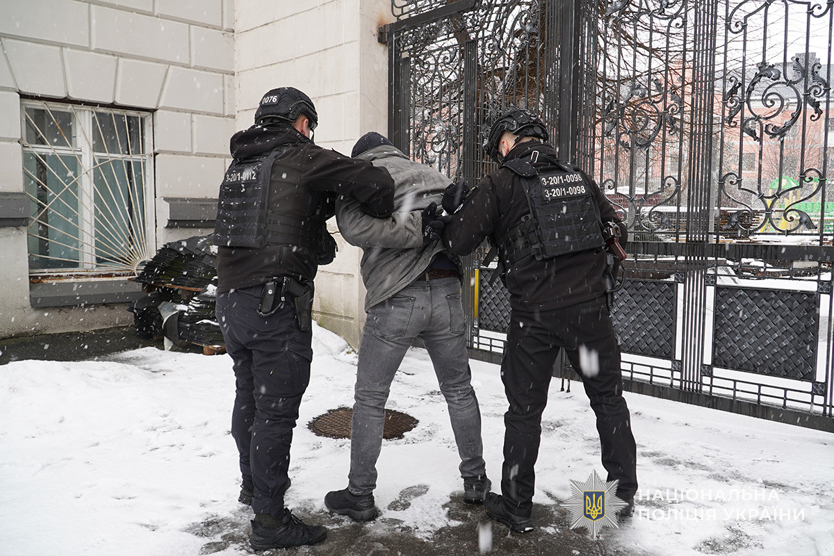 Офіцер безпеки миттєво заблокував вхідні двері, увімкнув сигнал тривоги та натиснув тривожну кнопку. За лічені хвилини на місце прибули працівники Управління поліції охорони, які знешкодили нападника, а кінологи обстежили територію на наявність вибухонебезпечних предметів.