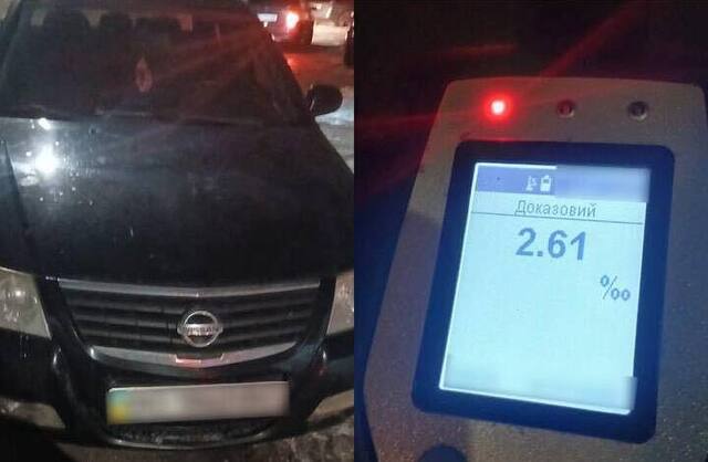 Першого керманича зупинили за порушення Правил дорожнього руху на автомобілі Nissan. Під час спілкування поліцейські помітили в нього ознаки алкогольного сп’яніння. Огляд провели на місці зупинки за допомогою приладу Драгер. Результат — 2,61 проміле.