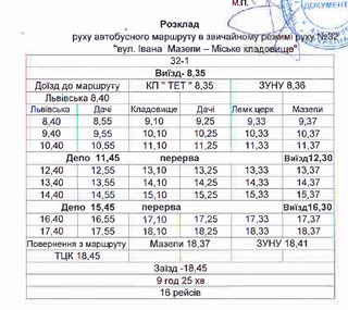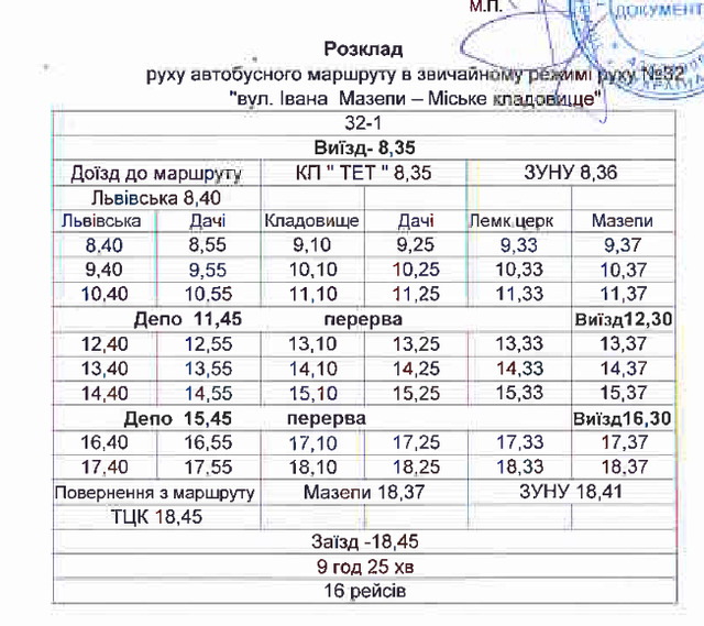 З 5 червня та на весь літній період внесено зміни у розклад руху автобусного маршруту №32 «вул. Івана Мазепи – Міське кладовище»