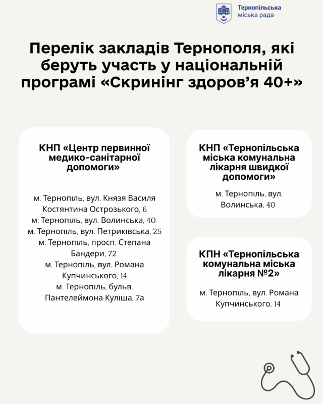 У яких комунальних медзакладах Тернополя можна пройти безоплатний «Скринінг здоров’я 40+»