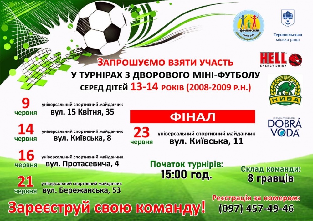 Для школярів невдовзі розпочнуться літні канікули. Щоб корисно та цікаво організувати дозвілля у Тернополі впродовж червня, серед дітей віком 13-14 років, проведуть турніри з дворового мініфутболу у різних мікрорайонах міста. Про це повідомили в пресслужбі міської ради Тернополя.