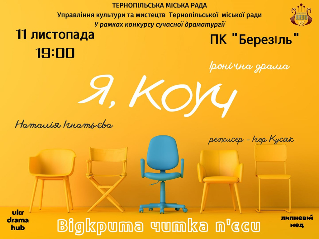 11 листопада о 19:00 в ПК «Березіль» імені Леся Курбаса відбудуться відкриті читання п'єси Наталії Ігнатьєвої - «Я, КОУЧ». Дійство організоване в рамках конкурсу сучасної драматургії «Липневий мед».