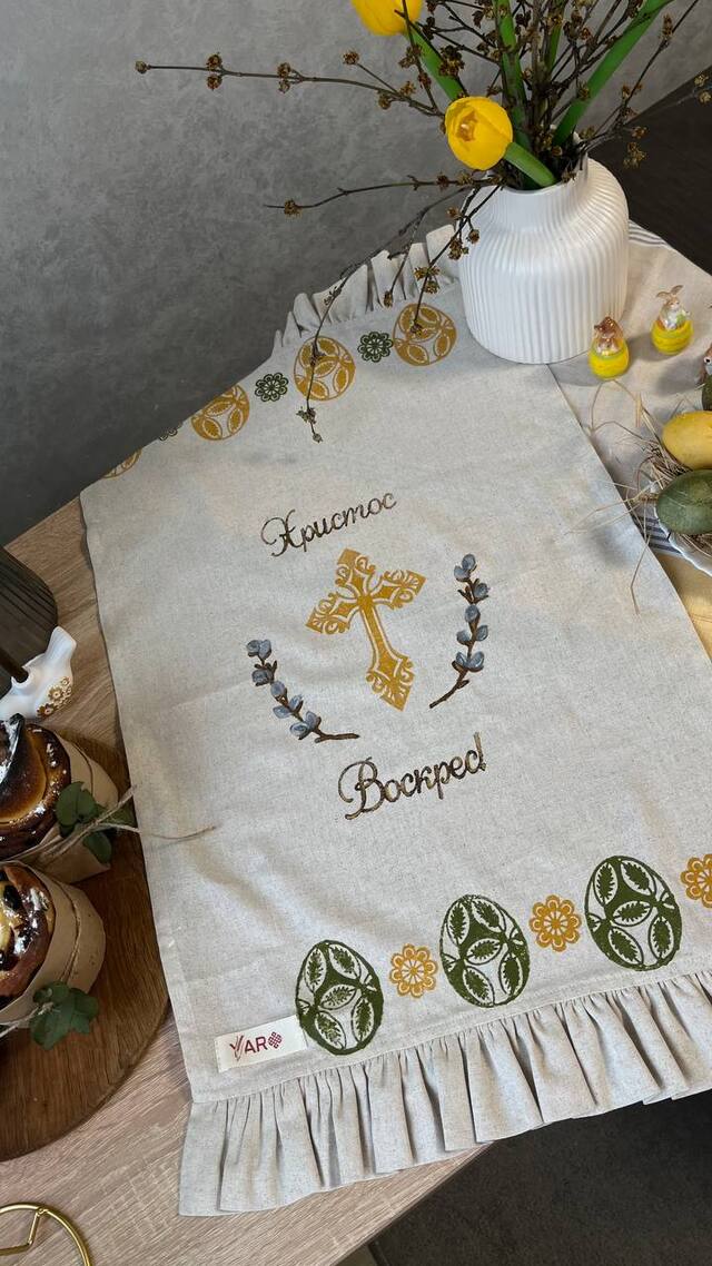 Великодні рушники у техніці вибійки створює тернополянка Яна Скрип. На своїх роботах вона зображає традиційні великодні орнаменти — паски, писанки, гілки верби. Зацікавилася цим заняттям минулого року під час декрету. Каже, для неї це хобі — спосіб відпочити, зібратися з думками та відволіктися.