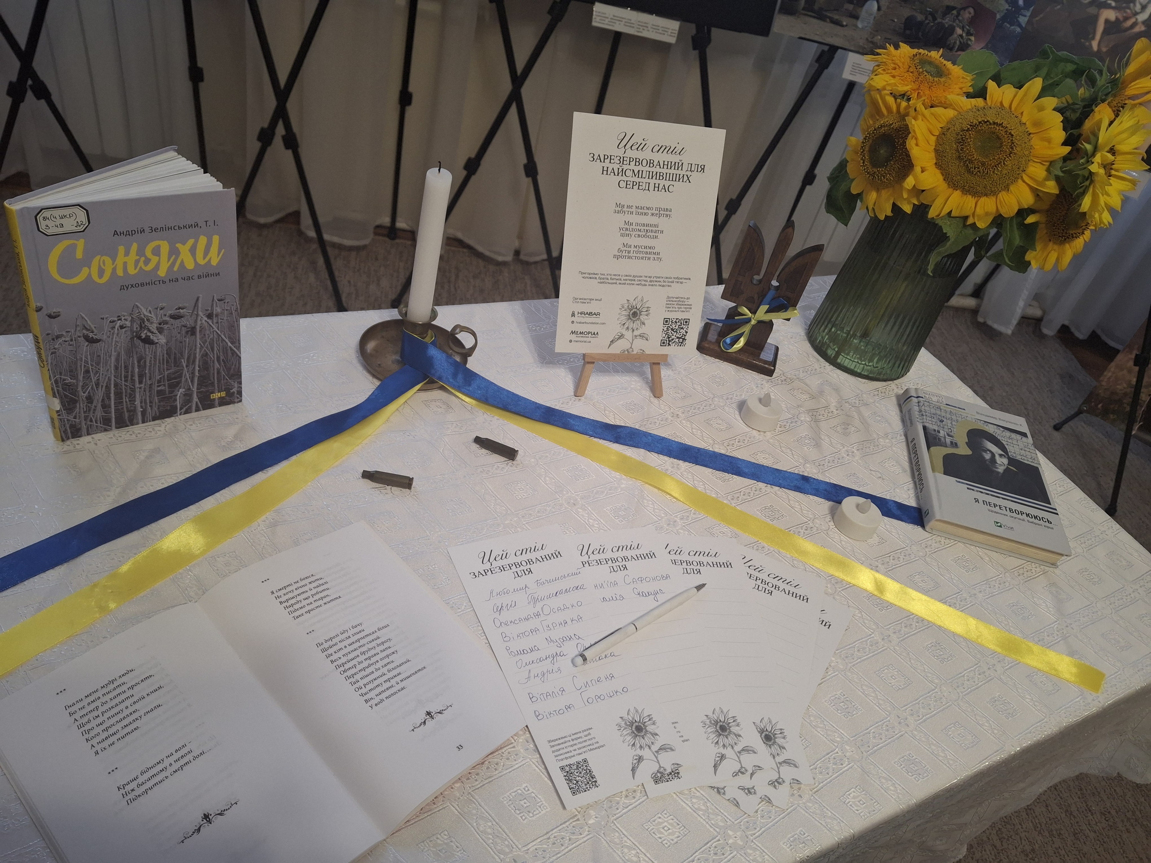 Окрім фотографій, на виставці представлено військову куртку Віктора та прапор із його зображенням від батальйону “Айдар”. Відвідувачі можуть також побачити “стіл пам’яті”, де на картці можна записати ім’я загиблого захисника, щоб таким чином зберігати пам'ять про тих, хто віддав життя за Україну.
