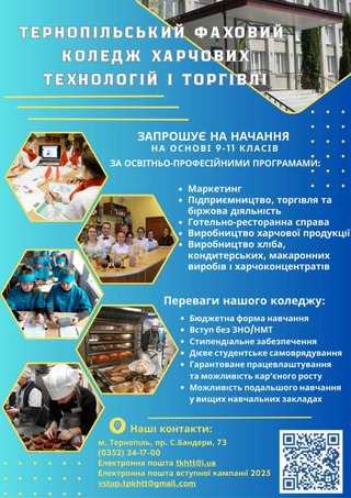 Тернопільський фаховий коледж харчових технологій і торгівлі запрошує на навчання випускників 9 та 11 класів.