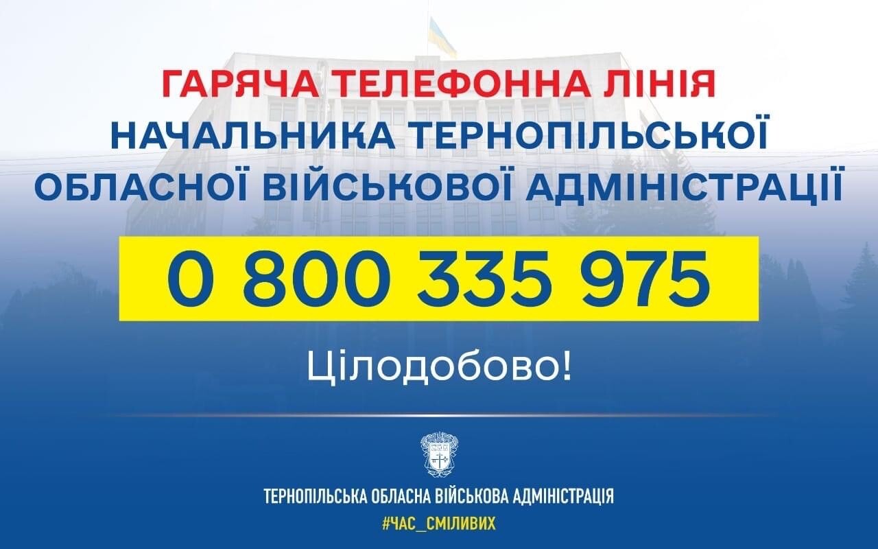 Цілодобова «гаряча лінія» обласної військової адміністрації запрацювала з 9 травня. Це зробили для того, щоб жителям області та переселенцям було легше знаходити шляхи вирішення актуальних проблем, розповів голова Тернопільської обласної військової адміністрації Володимир Труш.