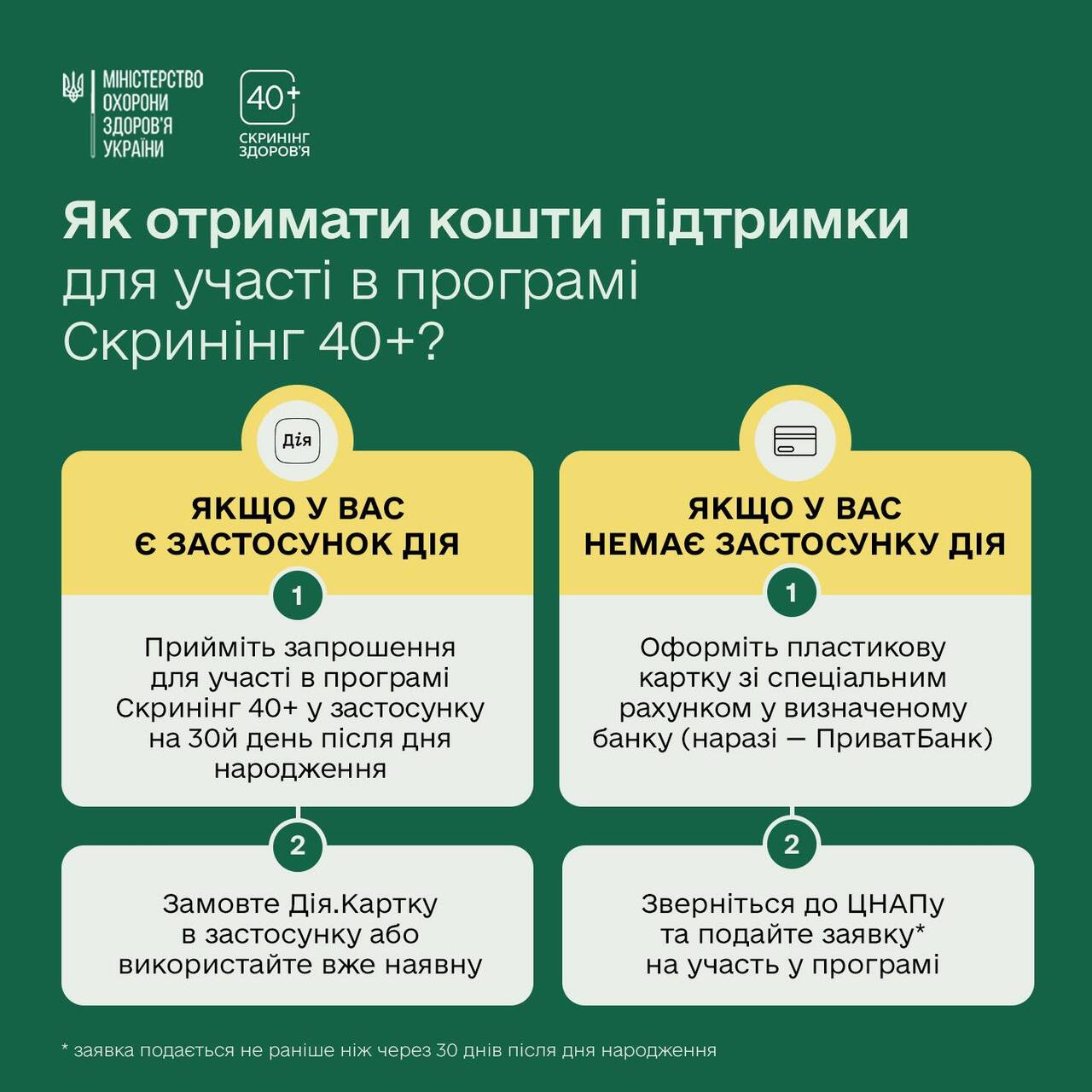 Запрошення на скринінг надходить через 30 днів після дня народження. Тобто: саме 31 січня минає 30 днів від дня народження тих, хто відзначив свої народини 1 січня. А отже — з цього дня вони можуть подати заявку та отримати 2000 гривень на проходження скринінгу. Наприклад, якщо ваш день народження був 2 січня і вам уже є 40 років чи більше, то своє сповіщення ви отримаєте 1 лютого, – йдеться в повідомленні.