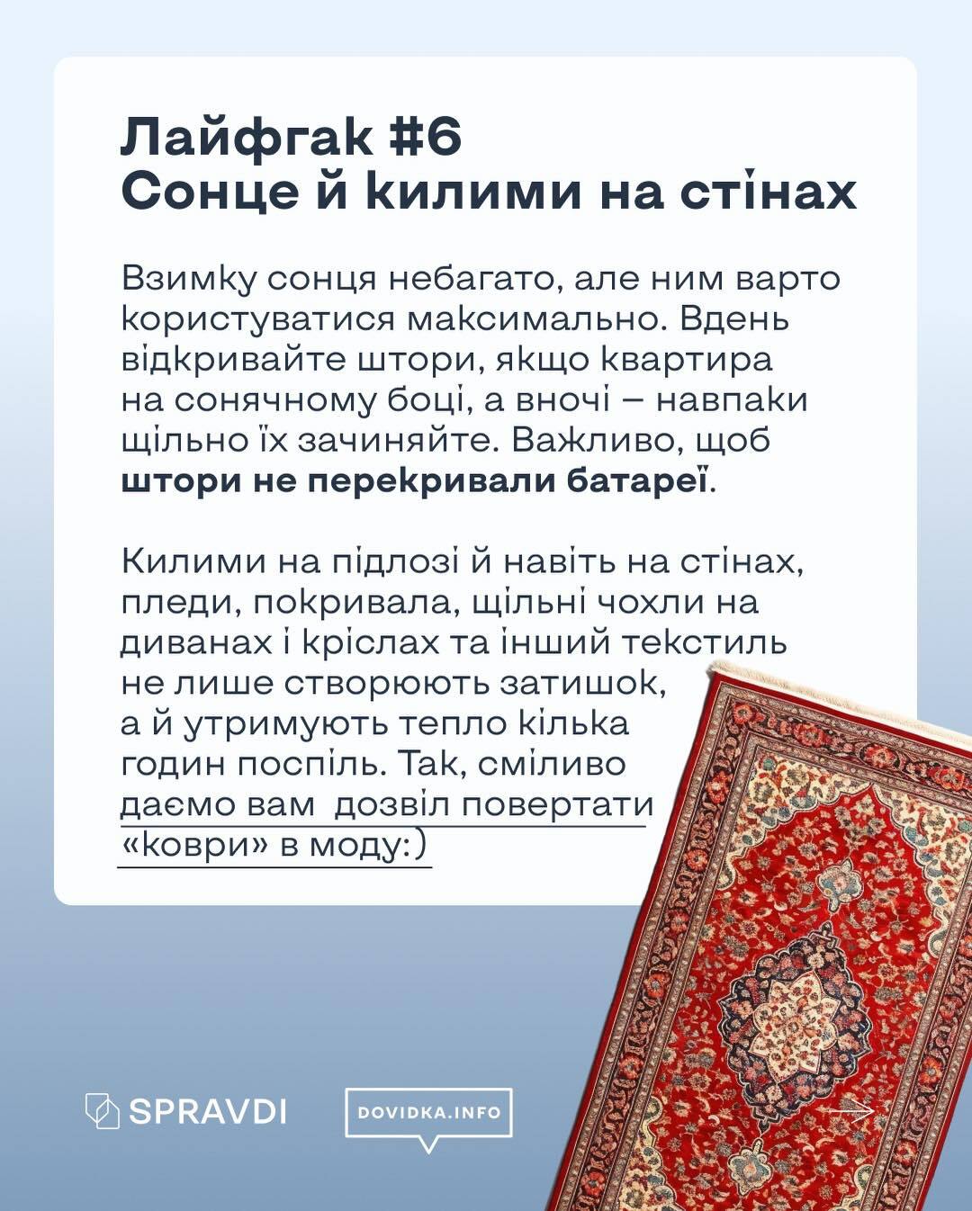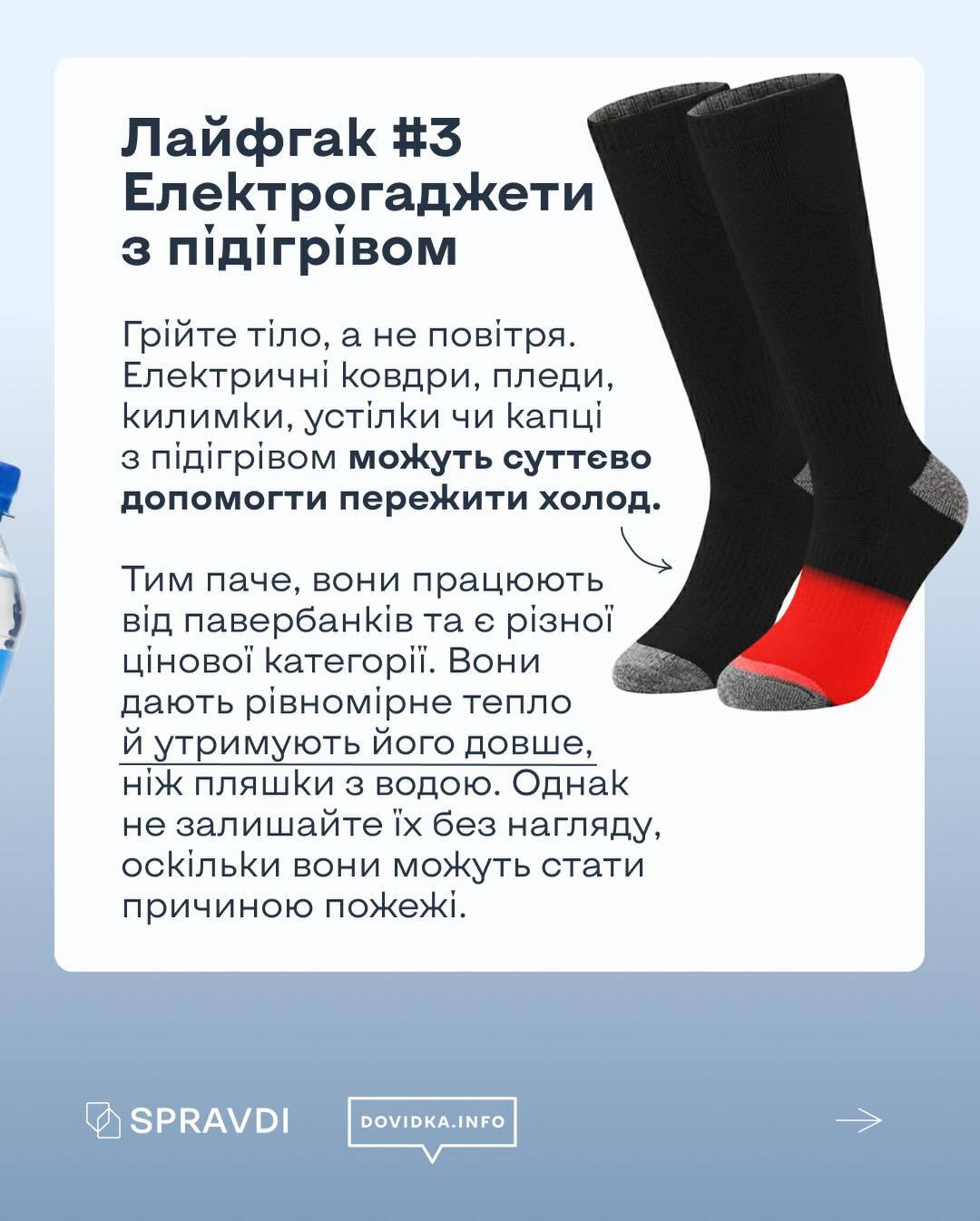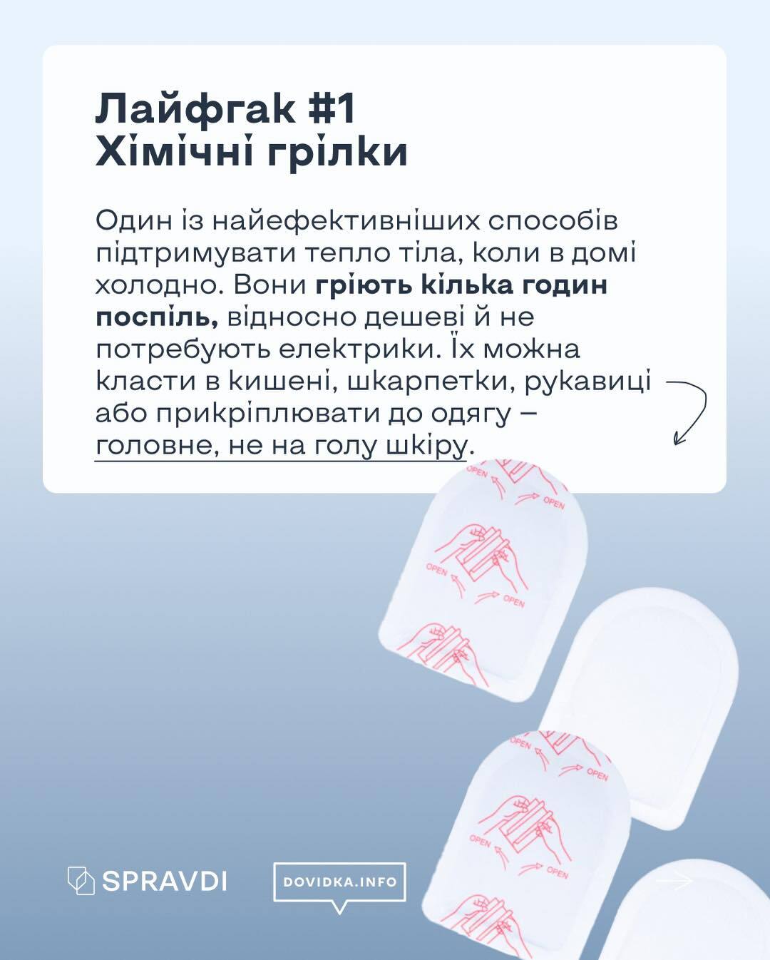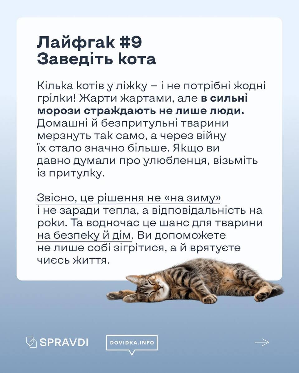 Проєкт Dovidka.info, створений державної установою «Центр стратегічних комунікацій та інформаційної безпеки», підготував серію практичних інструкцій і візуальних матеріалів для громадян. Вони містять поради щодо підготовки житла до можливих відключень, забезпечення доступу до інтернету без електропостачання, а також організації побуту в умовах блекауту.
