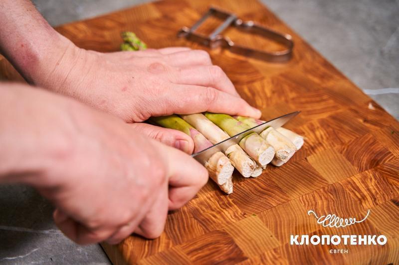 Очистіть стебло ножем або овочечисткою ще на 3–4 см знизу. Якщо спаржа молода — шкірка тонка, очищення можна мінімізувати.