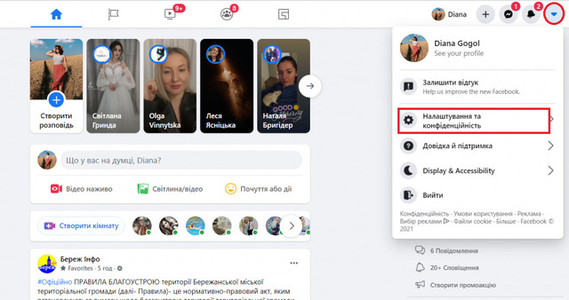 Для того, щоб це зробити у Facebook, потрібно зайти в налаштування на головній сторінці в правому верхньому куті.