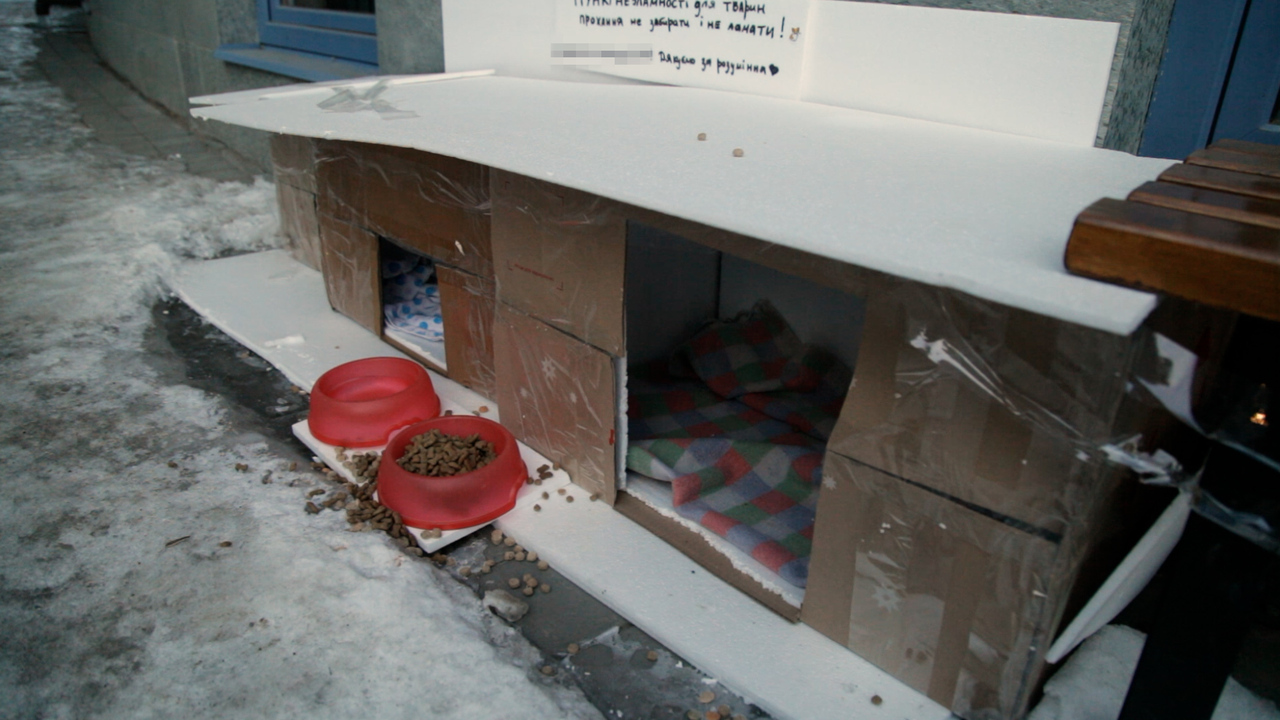 Так, біля кав'ярні на площі Героїв Євромайдану кілька тижнів тому облаштували “пункт незламності” для тварин, куди часто приходять коти та собаки, щоб погрітися та поїсти.