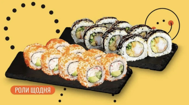 - Комбо Каліфорнія (470 г) - поєднання Каліфорнії з крабовим міксом в ікрі та Каліфорнії з креветкою в кунжуті зі знижкою –50%. Компактний і водночас насичений вибір.