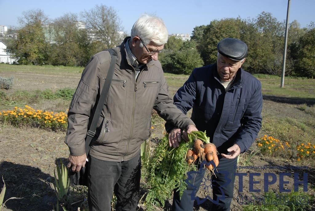 Підходимо до рядка із морквою. Пан Володимир запитує багаторічного директора Центру, заслуженого працівника освіти України Івана Герца, чи можна вирвати морквину, аби глянути як вродила. Той погоджується. Але зробити це непросто. Лише підваживши корінь лопатою, вдається витягнути одразу кілька велетенських морквин, посіяних цієї весни майже впритул одна до одної.