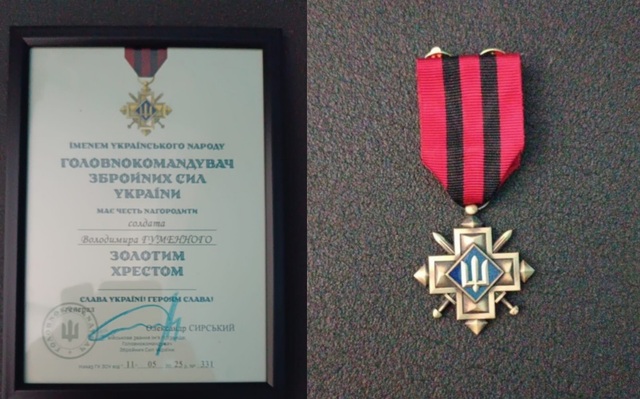 Державною нагородою Головнокомандувача Збройних Сил України «Золотий хрест»” нагородили бійця з Байковецької громади Володимира Гуменного. Про це повідомили у пресслужбі громади.