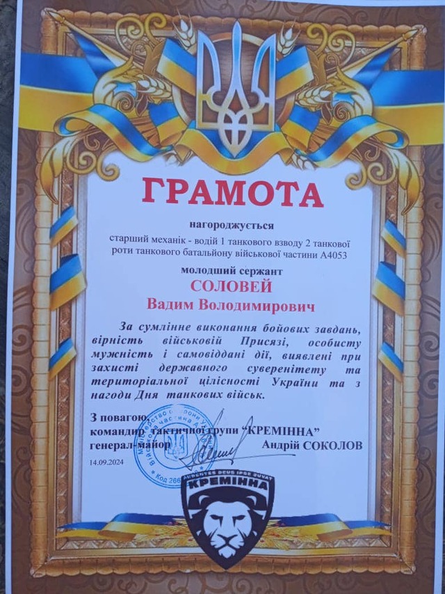 Військовому також вручили грамоту за сумлінне виконання бойових завдань, вірність військовій Присязі, особисту мужність та самовіддані дії, виявлені при захисті Державного суверенітету та територіальної цілісності України.
