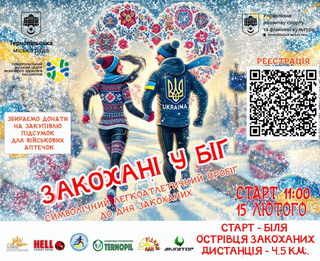 Тернополян та гостей міста запрошують взяти участь у легкоатлетичному забігу «Закохані у біг», який відбудеться 15 лютого на набережній Тернопільського ставу. Про це повідомили на сайті міської ради.
