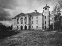 З північної сторони, на невисокому підвищенні над ставом, колись оборонний замок, перебудований на палац. Був спочатку будинком чотирикутним, квадратної форми, з чотирма баштами на кутах. При перебудові було знесено три крила будинку і дві башти, а залишено лише південне крило будівлі, таким чином створено невеликий прямокутний будинок висотою у два поверхи, розвернутий фронтом на північ, з двома шестикутними, дещо вищими, баштами по кутах.