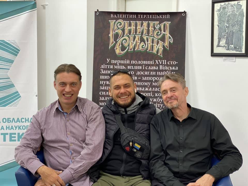 У виставковому залі Запорізької обласної універсальної бібліотеки відкрилася виставка українського художника-графіка Олега Кіналя «Лицарі віри і шаблі» про козацьку добу 17 століття за книгами «Книга Сили», «Воля» і «Віра» запорізького письменника Валентина Терлецького.