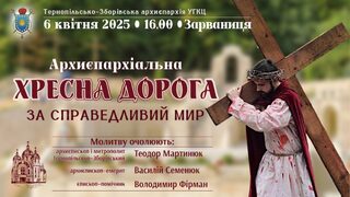 6 квітня о 16:00 у Зарваниці відбудеться архиєпархіальна Хресна дорога за справедливий мир. Християни зберуться, щоб спільно помолитися та відтворити події хресної ходи Сина Господнього. Про це повідомили у Тернопільсько-Зборівській архиєпархії Української Греко-Католицької Церкви.