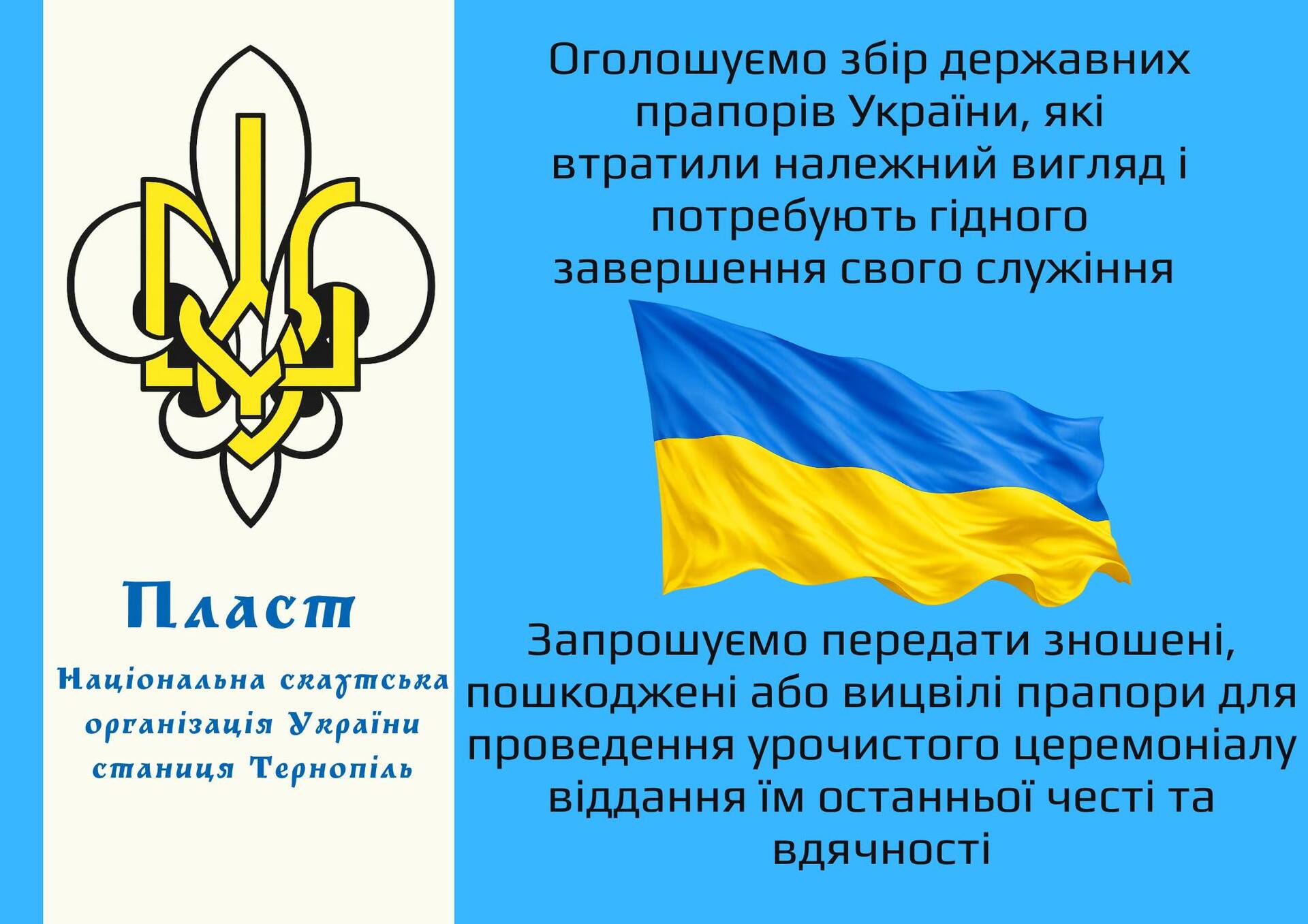 Національна скаутська організація України «Пласт», станиця Тернопіль, закликає мешканців області передати зношені, пошкоджені або вицвілі прапори для проведення урочистого церемоніалу віддання їм останньої честі та вдячності. Про це повідомила організаторка Зоряна Удич.